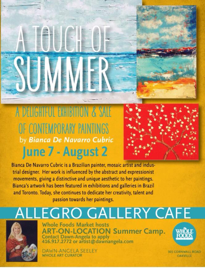 Please join Bianca De Navarro Cubric on June 7, 2015 for the opening night of her new exhibition at the Allegro Cafe (Whole Foods Oakville), located in downtown Oakville. The exhibition will run until August 2, 2015. Hope to see you there!